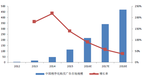 2012-2018年中國程序化廣告購買市場規模(單位:億元)