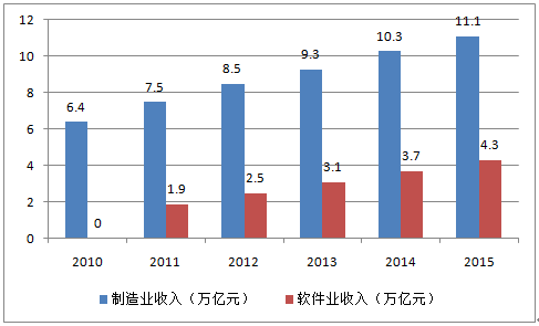 2015年我國電子信息產業實現銷售收入15.4 萬億元,同比增長10.4%,其中,電子信息制造業實現主營業務收入11.1 萬億元,同比增長7.6%。電子信息軟件業收入4.3 萬億元,同比增長16.6%。