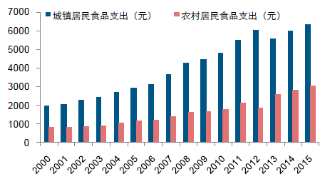 2000-2015年中國城鎮(zhèn)居民食品支出及農(nóng)村居民食品支出