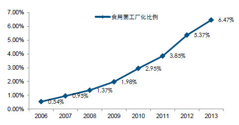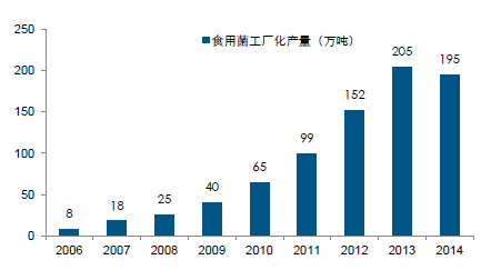 2、工廠化種植模式在中國正處在發(fā)展初期,還有很大的發(fā)展空間。2006 年以來,伴隨著中國食用菌消費(fèi)需求不斷上升,食用菌工廠化也蓬勃發(fā)展,生產(chǎn)比重不斷上升。截止到2014 年9 月,中國食用菌工廠化生產(chǎn)企業(yè)達(dá)到729 家,是2006 年47 家的16 倍。從2006 年到2014 年,中國食用菌工廠化年產(chǎn)量從8 萬噸上升至195 萬噸,年均復(fù)合增長率達(dá)49%。食用菌工廠化比例也由2006 年的0.54%逐年上升至2013 年的6.47%,預(yù)計(jì)未來10 年內(nèi)工廠化種植產(chǎn)量將占總產(chǎn)量的20%-30%。工廠化生產(chǎn)比例逐年上升是因該生產(chǎn)模式具有以下優(yōu)勢(shì):(1)極大提高食用菌生產(chǎn)效率,節(jié)約土地與勞動(dòng)力;(2)實(shí)現(xiàn)食用菌周年化生產(chǎn);(3)質(zhì)量可控,產(chǎn)品安全可靠;(4)吸收農(nóng)村富余勞動(dòng)力;(5)有利于產(chǎn)業(yè)轉(zhuǎn)型與產(chǎn)品升級(jí);(6)可復(fù)制性強(qiáng),有利于企業(yè)抓住市場(chǎng)機(jī)遇,實(shí)現(xiàn)迅速穩(wěn)定擴(kuò)張。
