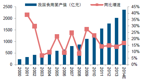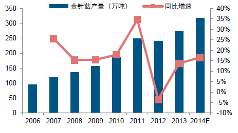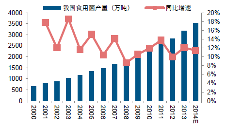 核心提示:中國食用菌產(chǎn)業(yè)發(fā)展迅速,產(chǎn)量由1978 年的不足10 萬噸,增長到2013 年的3170 萬噸,復(fù)合增速18%。目前中國食用菌年產(chǎn)量占世界總產(chǎn)量的 75%以上,總產(chǎn)值在中國種植業(yè)中的排名僅次于糧、棉、油、菜、果,居第6 位。中國食用菌的栽培中國食用菌產(chǎn)業(yè)發(fā)展迅速,產(chǎn)量由1978 年的不足10 萬噸,增長到2013 年的3170 萬噸,復(fù)合增速18%。目前中國食用菌年產(chǎn)量占世界總產(chǎn)量的 75%以上,總產(chǎn)值在中國種植業(yè)中的排名僅次于糧、棉、油、菜、果,居第6 位。中國食用菌的栽培種類有 70~80種,形成商品的有 50 種,具有一定生產(chǎn)規(guī)模的有 20 種以上。