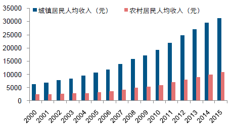 2000-2015年中國城鎮(zhèn)居民人均收入及農(nóng)村居民人均收入