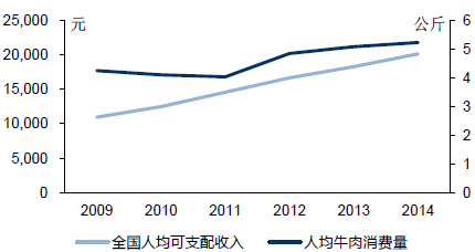 1、牛肉消費量持續增長是大勢所趨。世界銀行預測我國2015-2017 年GDP 增速將放緩至7.1%,7%和6.9%左右,經濟增速的放緩將直接導致居民人均收入增速的下降。按照世界銀行的預測,我國2015-2017 年人均可支配收入雖然增速降低但數量仍呈增長趨勢,2017 年人均可支配收入有望達到24705 元。收入的持續提升加上我國居民消費結構的變化將會進一步促進未來牛肉消費需求增長。