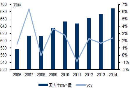 國內牛肉產量增長穩定,年復合增速在2%左右,主要供應國內市場。我國是世界第三大牛肉生產國。2014 年我國國內牛肉產量達到689.24 萬噸,占世界牛肉總產量的15%,相比于2006 年576.67 萬增長19.5%,年復合增速在2%左右,連續近10 年保持平穩增長態勢。2014 年我國國內牛肉產量只有10%左右約69 萬噸出口,絕大多數產量用來滿足國內需求。