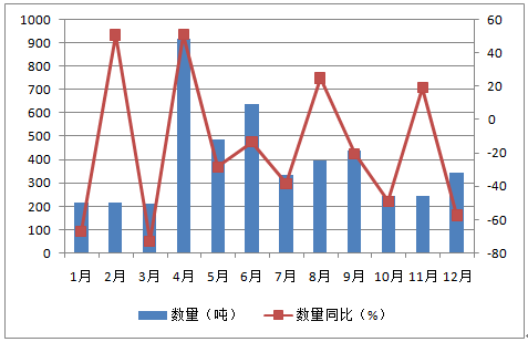 月份數量(噸)金額(千美元)數量同比(%)金額同比(%)1月2161,754-66.6-70.12月2162,06450.845.13月2111,836-72.6-74.74月92083995147.35月4884,961-28.2-22.86月6395,986-13.2-12.27月3353,240-38.2-35.28月3983,81124.925.99月4404,110-20.4-20.810月2462,432-48.7-41.511月2462,53519.459.812月3473,594-57.1-47.22015年1-12月中國牛肉出口數量統計圖