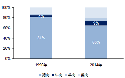 1990與2014年牛肉消費在肉類整體中占比對比圖