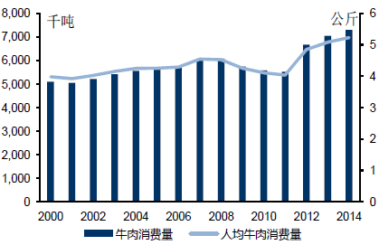 1、國內牛肉消費增速較快,但人均消費量仍較低。我國是世界第三大牛肉消費國,2000-2014 年國內牛肉消費量從510.2 萬噸增長至729.7 萬噸,年復合增速為2.4%,高于同期全球牛肉消費量年復合增速1.8%。2015 年1-10 月份國內牛肉消費量已超過去年全年達到735 萬噸,增長勢頭依舊強勁。但在人均消費方面,我國2014 年牛肉人均消費量僅為5.2 公斤,低于世界其他主要牛肉消費國家,同世界同期平均消費量8.6 公斤相比也處于較低水平。