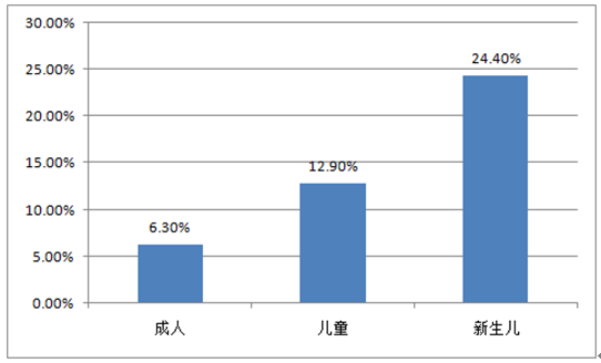 3、兒童不合理用藥高達(dá)12%-32%,對(duì)兒童的健康造成嚴(yán)重威脅,兒童藥物不良反應(yīng)率是成人的2倍,不良反應(yīng)發(fā)生率約12.9%,新生兒更高達(dá)24.4%。