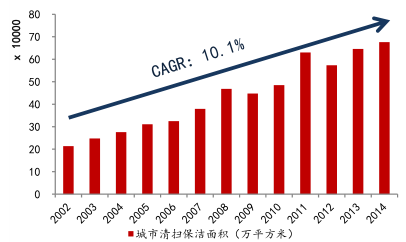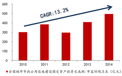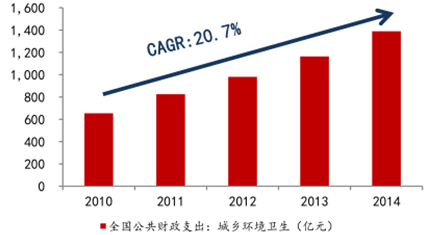 隨著我國快速的城鎮化發展, 政府在城鄉基礎建設和市容環境衛生方面的投入也在加大。2013 年城鄉環境衛生建設的財政支出達到了 1000 億元,并且過去三年的環境衛生支出增速都在 20%左右。我們預計未來隨著城市化的發展,以及國家對環境保護的重視程度,城市垃圾清運和道路清掃的工作量會持續增長,同時對工作質量的要求也會上升,在量和價值雙重提升下,行業投資將持續保持高增長。