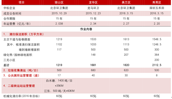 生活污水生活垃圾填埋生活垃圾焚燒環衛服務工業固廢產能(萬噸/日)200005050-5000噸投資(萬元/噸/日)0.22040-3000總投資額(億元)40001000200010001500運營收入(億元)14609138319001000凈利潤(億元)29246134171250凈利率20%50%35%9%25%ROA7%5%7%15%17%固定資產周轉率0.40.10.2>20.7目前,環衛行業正處于全面推進市場化階段,從目前招標的幾個項目和各公司簽項目的進度看,行業已進入跑馬圈地階段。 比如,到 2016 年 3 月底,啟迪桑德已獲得 70 多個環衛項目,公司規劃到2016 年底環衛項目數量將突破 150 個,合同金額在 30-40 億元;龍馬環衛 2016 年已新簽項目年營收體量達到 3.4 億元,且預計年底有望突破 10 個億。新安潔、玉禾田也均在擁抱資本市場,借助融資渠道拓寬以加速項目獲取進度。