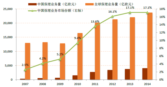 2007-2014年中國保理業務量以及占全球保理市場份額