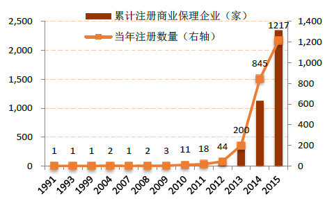 1991-2015年中國累計和新增注冊商業保理企業數量