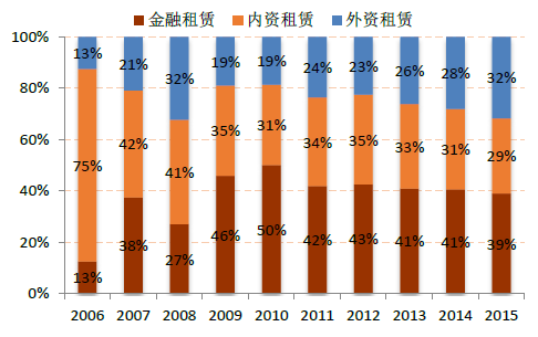 2006-2015年中國融資租賃合同市場份額