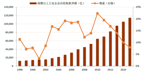 1998-2014年規模以上工業企業應收賬款凈額及增速