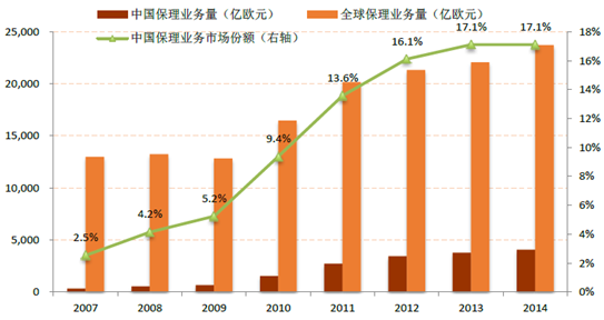2007-2014年中國保理業務量以及占全球保理市場份額