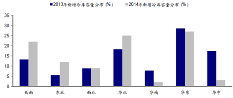 中西部冷庫建設存在很大發展空間。中西部承擔全國大部分生鮮農產品批發交易, 而當前批發市場是農產品流通主要渠道。目前我國冷庫分布失衡,東部沿海冷庫逐漸飽和,但是中西部依然建設不足,未來存在可發展空間。2013-2014年我國新增冷庫容量七大區域分布(%)