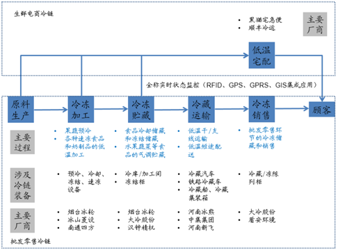 3、冷鏈物流涵蓋冷凍加工,冷藏貯藏,冷鏈運輸和冷鏈銷售全過程。冷鏈行業景氣度提升會帶動冷庫,冷藏運輸車和速凍設備等冷鏈設施設備受益。