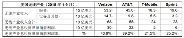 核心提示:2015年的美國無線行業(yè)并不平靜,各大運營商在一個日漸飽和的市場中展開了強大的促銷和激烈的競爭活動。將在接下來的部分比較Verizon、AT&T、Sprint和T-Mobile四大運營商2015年前9個月的財務(wù)和經(jīng)營業(yè)績,并闡明美國無線行業(yè)2015年的美國無線行業(yè)并不平靜,各大運營商在一個日漸飽和的市場中展開了強大的促銷和激烈的競爭活動。將在接下來的部分比較Verizon、AT&T、Sprint和T-Mobile四大運營商2015年前9個月的財務(wù)和經(jīng)營業(yè)績,并闡明美國無線行業(yè)內(nèi)部一些更為廣泛的發(fā)展趨勢。