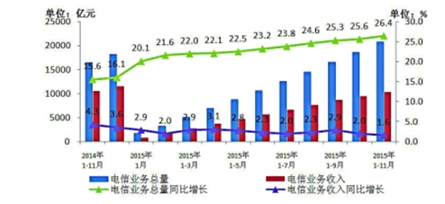 2015年1~11月我國電信業(yè)業(yè)務總量完成20792億元,同比增長26.4%