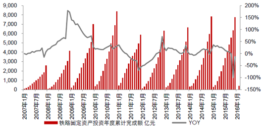 2007-2016年我國鐵路固定資產投資年度累計完成額及增速