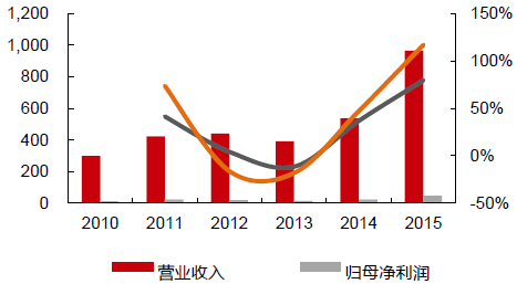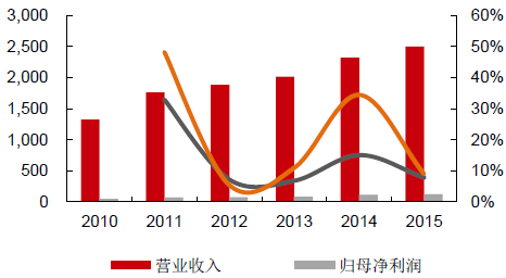 2010-2015年中國鐵路設備行業年度營收/歸母凈利潤及增速(億元)