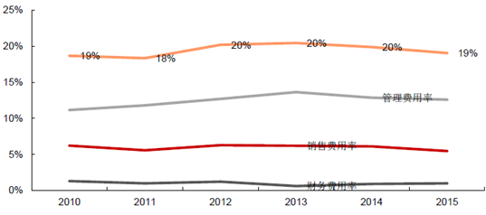 鐵路設備行業2015年期間費用率整體依然趨穩,一直處于20%左右的水平。其中,財務費用占比、銷售費用占比較低且持平或略有下滑;而為打造世界高鐵名片,行業內各公司投入研發經費,導致管理費用一直居高。
