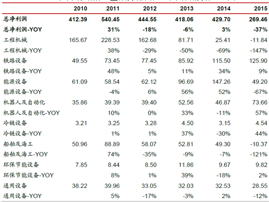 類別201020112012201320142015營業總收入4927.036635.426659.946692.957778.097046.02營業總收入-YOY-35%0%0%16%-9%工程機械1355.431809.341642.741386.351083.46799.58工程機械-YOY-33%-9%-16%-22%-26%鐵路設備1324.061760.081886.862015.282318.762500.5鐵路設備-YOY-33%7%7%15%8%能源設備464.39529.46603.65772.231619.581132.28能源設備-YOY-14%14%28%110%-30%機器人及自動化504.35615.76620.47672.84719.4731.77機器人及自動化-YOY-22%1%8%7%2%冷鏈設備29.6438.733.3134.4935.3951.18冷鏈設備-YOY-31%-14%4%3%45%船舶及海工777.791286.651187.981153.811369.341238.41船舶及海工-YOY-65%-8%-3%19%-10%環保節能設備98.93120.56121.71133.36138.33108.39環保節能設備-YOY-22%1%10%4%-22%通用設備372.44474.87563.22524.58493.84483.9通用設備-YOY-28%19%-7%-6%-2%行業凈利潤整體大幅下滑,依然是行業需求不振,費用成本相對剛性,不斷侵蝕利潤導致。具體來看,工程機械行業2015年凈利增速大幅下滑-147%,拉低行業水平;鐵路設備行業凈利增速為9%,同樣是因為中國北車與中國南車合并為中國中車,中車2015年收入增速高達122.35%拉動行業增速;能源設備行業凈利增速下降67%,盈利極具惡化;機器人及自動化行業2015年受制于機床類公司虧損,導致凈利增速僅為57%;冷鏈設備行業2015年凈利增速大幅上漲44%;2015年船舶及海工行業凈利同比下降-121%,環保設備行業凈利增速略有下滑,2%,通用設備凈利潤下降12%。