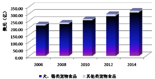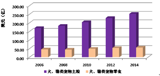 如上圖所示,受益于犬、貓類寵物食品市場規模的不斷擴大,美國寵物食品行業的市場規模持續增長。自2006 年至2014 年間,年均增長率約為4.50%,至2014 年末,美國寵物食品的市場規模約為321.53 億美元,其中犬、貓類寵物食品的市場規模約為306.93 億美元,占寵物食品總規模的95.46%。