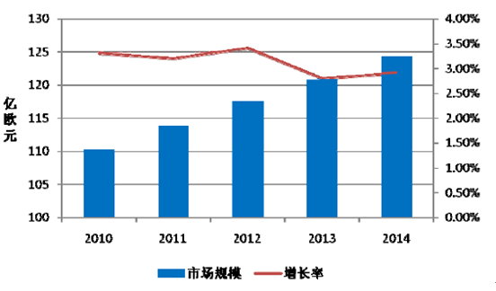 如圖所示,雖然受經濟增長放緩的不利因素影響,歐盟地區的寵物市場規模仍保持持續增長態勢。自2010 年至2014 年間,年均增長率約為3.06%,其中,2010 年至2012 年增長率在3 %以上,2013 年和2014 年增長率分別降至2.8%和2.9%,總體上看仍處在增長階段。至2014 年末,歐盟國家的寵物食品銷售額達到124.3 億歐元,其中,以犬糧和貓糧為主,具體如下所示: