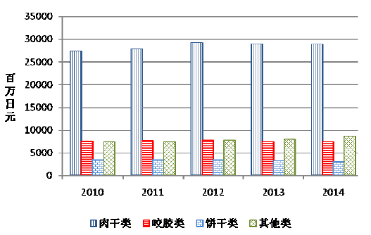 從上圖可見,日本犬、貓類寵物零食市場以肉干類產品為主,至2014 年末肉干類零食市場規模約為288 億日元,約占日本犬、貓類寵物零食市場規模的60.26%,而其增長率略高于犬、貓類寵物零食市場的增長,自2010 年至2014年間,年均增長率約為1.32%。