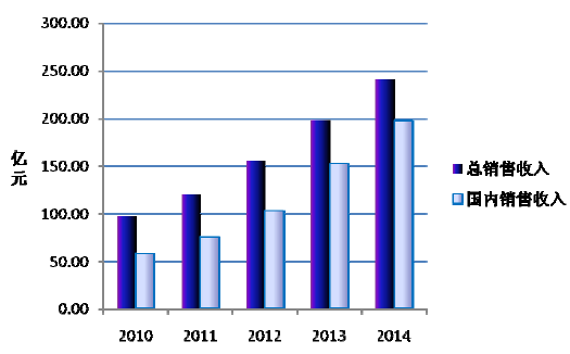 我國寵物食品行業銷售收入同樣發展迅速,自 2010 年至2014 年間,年均增長率達25.45%,至2014 年末,我國規模以上寵物食品企業收入總額為240.66億元。我國寵物食品行業銷售規模的迅速擴大,主要得益于國內市場規模的快速增長,從上圖可以看出,國內銷售收入的增長明顯快于行業總銷售收入的增長,自2010 年至2014 年間,國內銷售收入年均增長率達35.88%,至2014 年末,我國規模以上寵物食品行業國內銷售收入為197.36 億元,可以預見一段時期內我國寵物食品市場將有望持續快速發展。