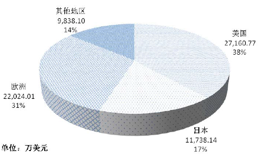 2013 年我國寵物食品對美出口出現較大幅度下降,2014 年下降幅度趨于緩和,同期對日本亦出現小幅下降,而對歐洲和其他地區的產品出口則自2010 年起保持持續增長態勢,導致我國寵物食品出口由集中于美國市場向多區域分化發展,2014 年我國寵物食品出口區域分布情況如下所示: