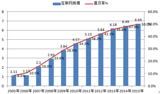 2005-2015 年中國互聯網規模和普及率
