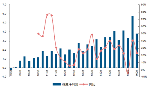 龍頭上市公司老板電器業績表現依舊亮眼,其2015 年歸屬凈利潤同比增長44.60%,其中四季度同比增長達50.00%且2016 年一季度仍舊實現36.97%的增長;而華帝股份在內部整合逐漸完成之后,業績也重新回到高度增長軌道,在2015年大幅下滑25.98%之后,2016 年一季度同比增長29.73%。