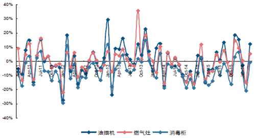 2015 年油煙機終端銷量同比增長0.43%,而燃氣灶及消毒柜終端零售量同比分別下滑1.36%及7.69%;但品牌及渠道優勢明顯的廚電上市公司市場份額持續提升,而隨著2015 年年初以來地產銷售的滯后拉動效應持續顯現,預計廚電行業終端需求有望持續改善。