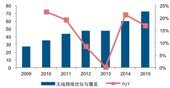 2009-2015年無線網絡優化與覆蓋廠商營業收入(億元,%)