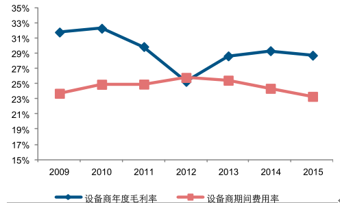 毛利率方面,2015 年設備商整體毛利率水平為 28.76%,同比下降 0.6 個百分點;與此同時,行業整體期間費用率穩定下行,2015 年設備商的期間費用率為 23.32%,同比下降 1.06 個百分點,為設備商盈利能力提升提供保障。
