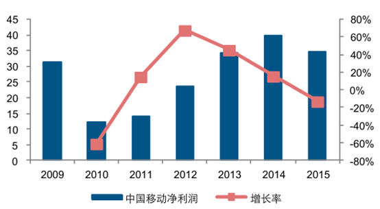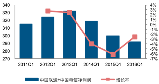 2015 年三大運營商共實現凈利潤 1320.65 億元,同比增長 0.9%。但是,但考慮到中國移動、中國聯通、中國電信出讓鐵塔資產后分別獲得一次性收益 101 億、92.5 億和 39.37 億, 其實際利潤水平呈現下滑趨勢。2016 年第一季度,三大運營商共實現凈利潤 291.65 億元,同比下降 2.54%。