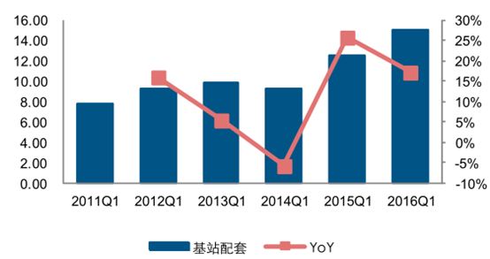 2011-2016 年第一季度基站配套設備營業收入(億元,%)