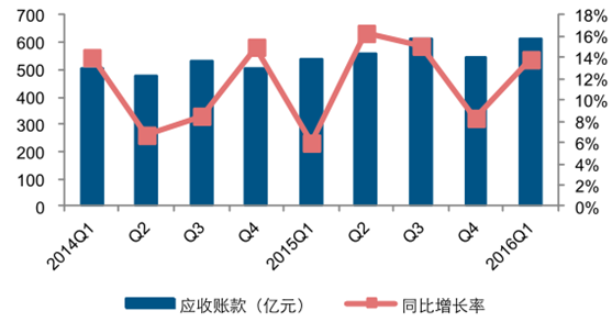 2014-2016Q1 設備商應收賬款(億元,%)