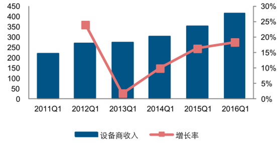 2011-2016年第一季度設備商整體收入情況(億元,%)