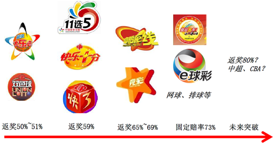 從彩種創新角度看,其創新包括對于彩票游戲的改革創新,研發新的玩法、新的游戲以及對于彩票返獎率的革新,目前從趨勢上看,新彩種的返獎率不斷提升,各個彩種也不斷涌現,未來對各省市新開彩種的預期也有助于行業獲得新的增長動力。