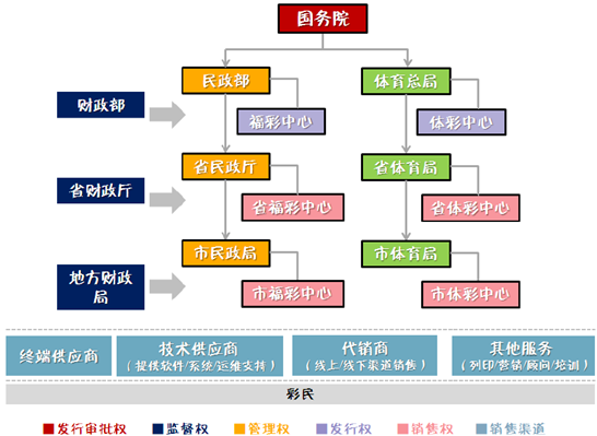 目前我國已經形成了從中央到地方完整的彩票行業監管格局,政府部門各司其職,履行福利彩票和體育彩票發行審批權、監督權、管理權、發行權以及銷售權。