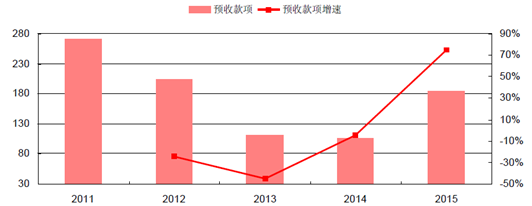 2011-2015年中國白酒行業預收款項及增速(單位:億元)