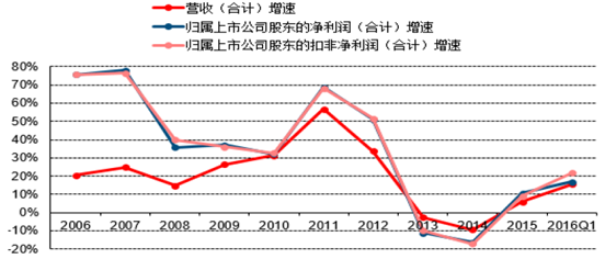 2006-2016年中國白酒行業營收及歸屬于上市公司股東凈利潤和扣非凈利潤增速