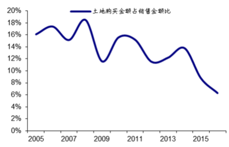 2005-2015年全國土地購置金額占銷售金額比值