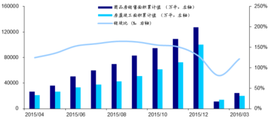 從銷竣比情況來看,截至 2016 年3 月銷竣比數據為1.21,較2016 年初的0.81 保持反彈。