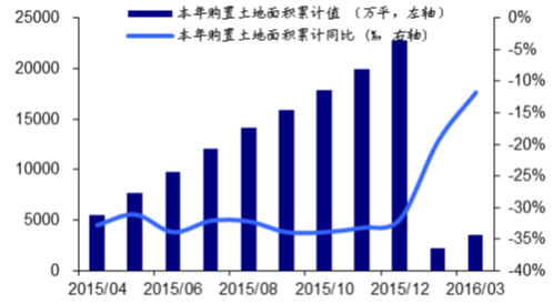 2016 年1-3 月,全國房地產開發企業完成土地購置面積0.36 億平方米,同比減少11.70%;