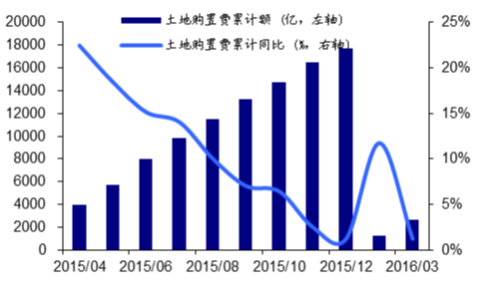 2015-2016年全國土地購置費同比情況