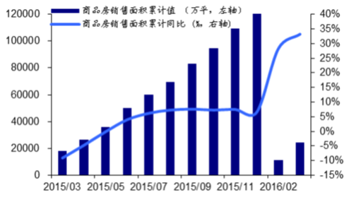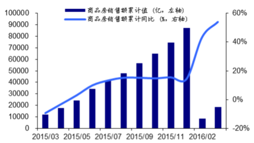 4、2016 年1-3 月,全國商品房銷售面積2.43 億平方米,比去年同期增加33.10%。3 月份,當月商品房銷售面積1.31 億平方米,同比增加16.29%。整體行業銷售情況明顯高歌猛進。1-3 月商品房累計銷售額達到1.85 萬億元,較去年同期增加54.10%。